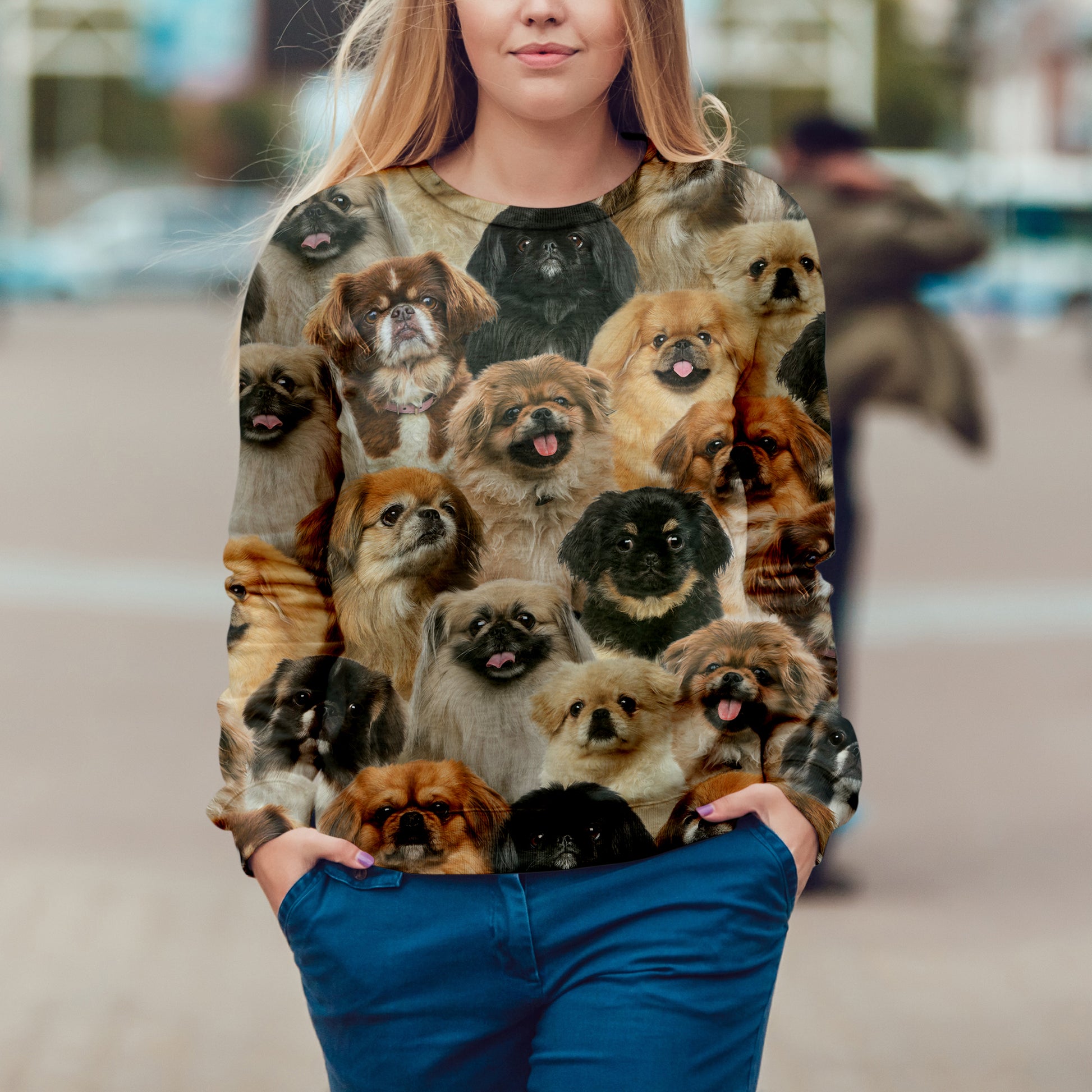 Toute la surface semble tissée des yeux et des émotions de pékinois – chacun vous renvoyant un regard empreint de loyauté, d'affection et d'une étincelle de vie qui vous touche instantanément. C'est bien plus qu'un simple sweat-shirt : c'est une histoire d'amour, de réconfort et de complicité, capturée dans le tissu.